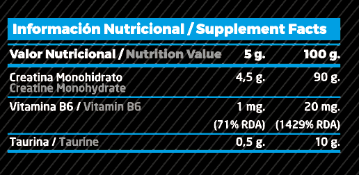 INGREDIENTES: Creatina monohidrato micronizada, Taurina y Vitamina B6 (Clorhidrato de Piridoxina).