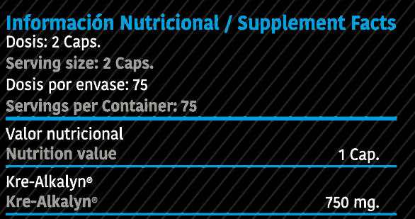 INGREDIENTES: Kre-Alkalyn pH-correct, Gelatina (Cápsula), Estearato de Magnesio E572, Dióxido de Silicio